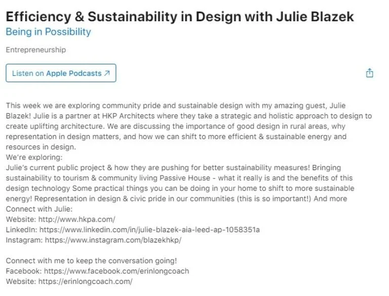 Julie Blazek was a recent guest of Erin Long’s podcast “Being in Possibility” where she got a chance to discuss her passion for sustainability, current projects, and representation in design. Listen here to the conversation – which includes what it means to live in possibility, and what that means to Julie and her work and life.