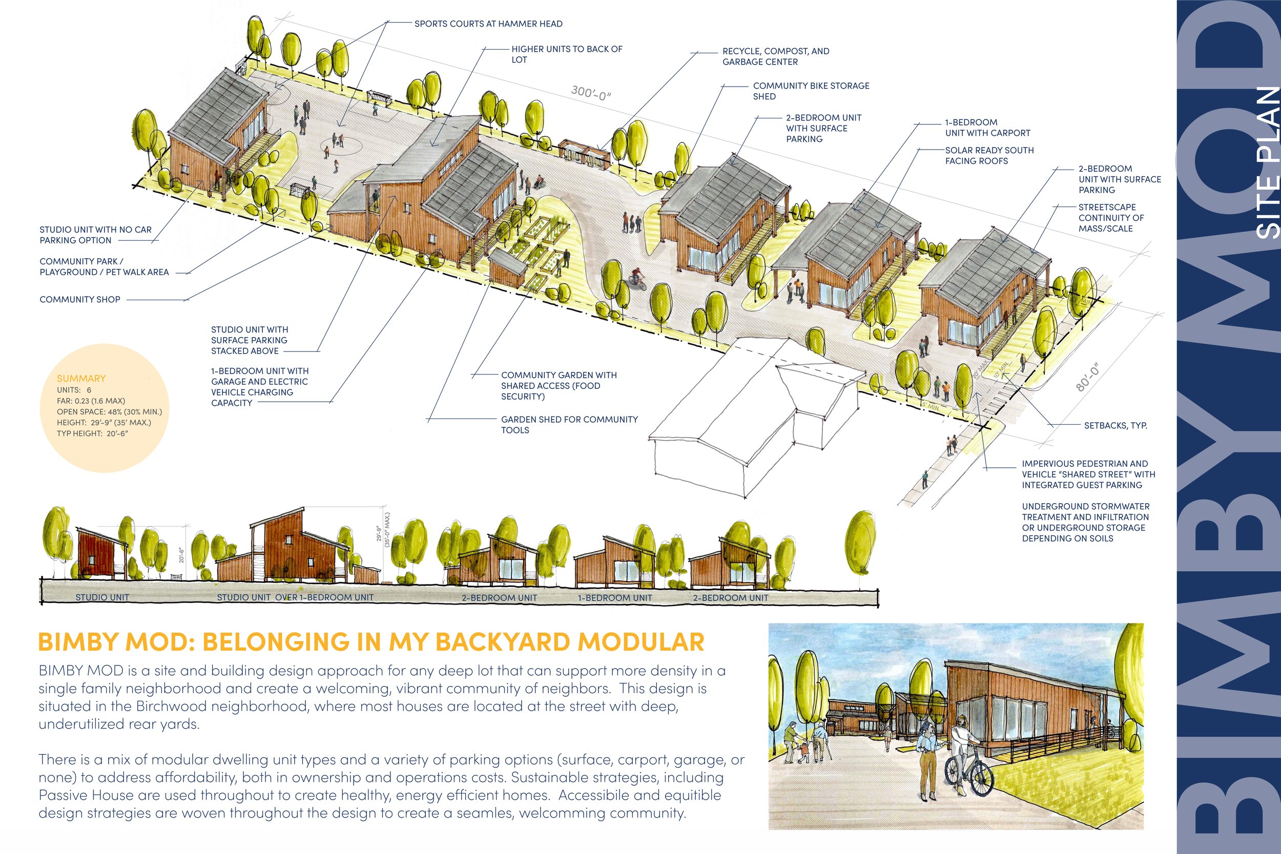 BIMBY MOD, Belonging in My Backyard Modular, is a site and building design approach for any deep lot that can support more density in a single-family neighborhood. Designed as Cottage Housing, BIMBY MOD creates a vibrant community of neighbors on a single underutilized lot.