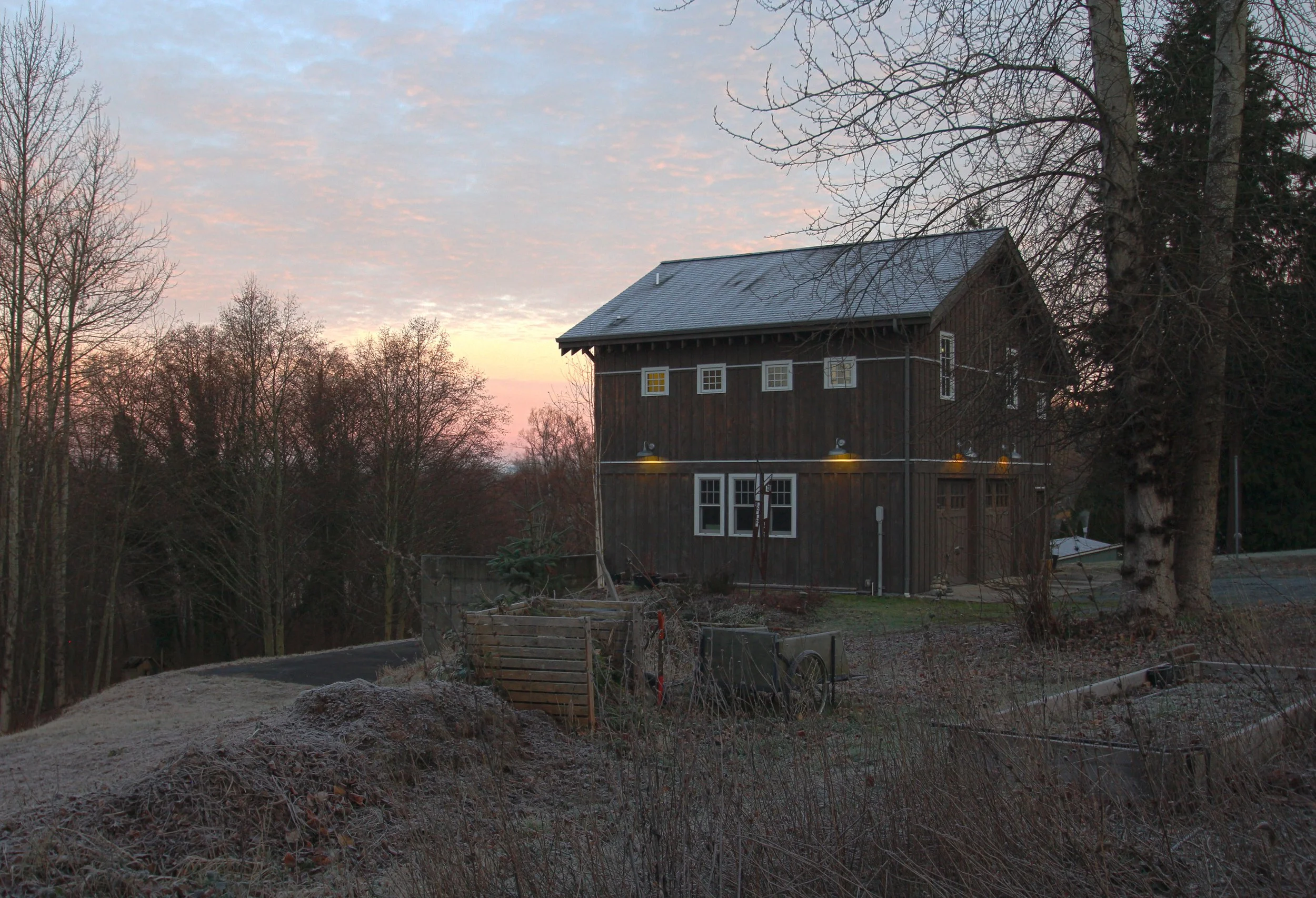 This studio/garage was designed as a legal Accessory Dwelling Unit (ADU) in south Mount Vernon. The studio is outfitted with a Murphy bed, reading nook, kitchenette, bathroom and separate clean-up area for art supplies. The stairs and bathroom sink are reclaimed Douglas fir beams and the floor is Marmoleum over radiant heating, which is incredibly versatile and warm underfoot. Balanced natural daylighting with an emphasis on the even north light was a key focus of the design. Exposed rafters, collar ties, and plywood sheathing (with insulation on the top side of the roof) make for a warm, cozy environment.