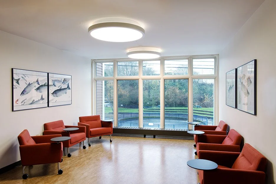 The new instructional building includes specialized classrooms, wet and dry laboratories, student equipment lockers, and interpretive hatchery displays for public viewing. The building has been designed and constructed to meet a minumum rating of LEED Silver.