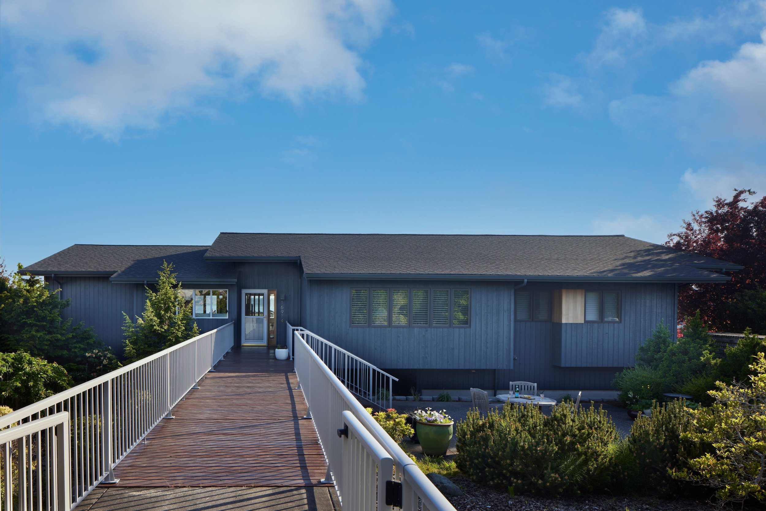 The house is a two-story residence with views of Skagit Bay. The project reimagines the upper level to transform the previously divided spaces into a large open kitchen and dining area. An addition to the east side of the house creates space for the relocated and expanded laundry room and library, as well as an extension of the renovated bathroom, all overlooking the mature landscaping around a lower patio. The entire upper level is designed for the owners to age in place, and the lower level contains an office, guest bedroom, garage and workshop.