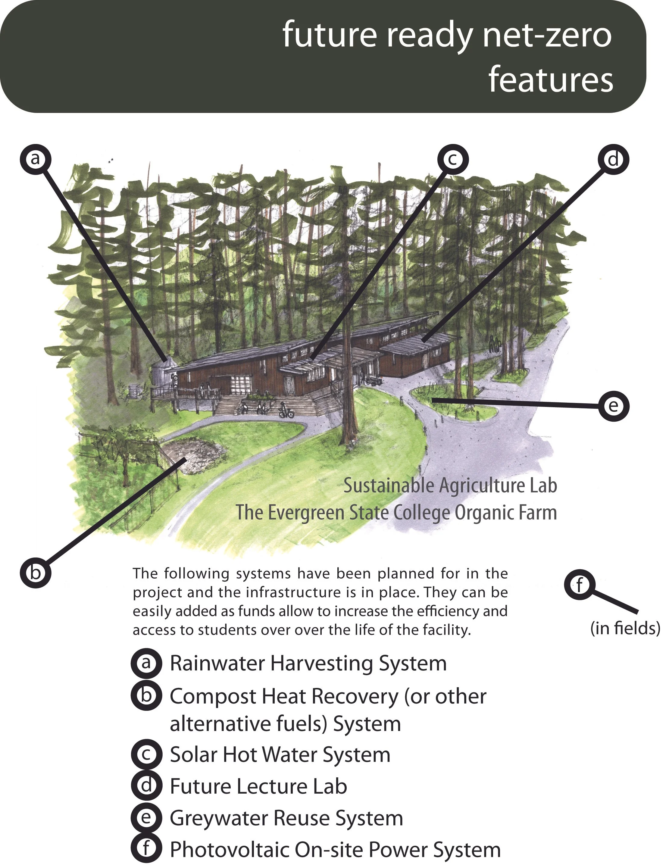 The project is a new 2,000 square foot building at the Organic Farm site. The original Program included a soils lab, food demonstration lab, lecture classroom, office space and support spaces. Due to budget constraints, the program was broken into two structures. A future, alternate building and deck was planned, but not built. The facility complements the existing farm operations and also serves as a multi-purpose center for instruction as well as community events. The building and site improvements integrate with the overall farm Long-Range Plan.