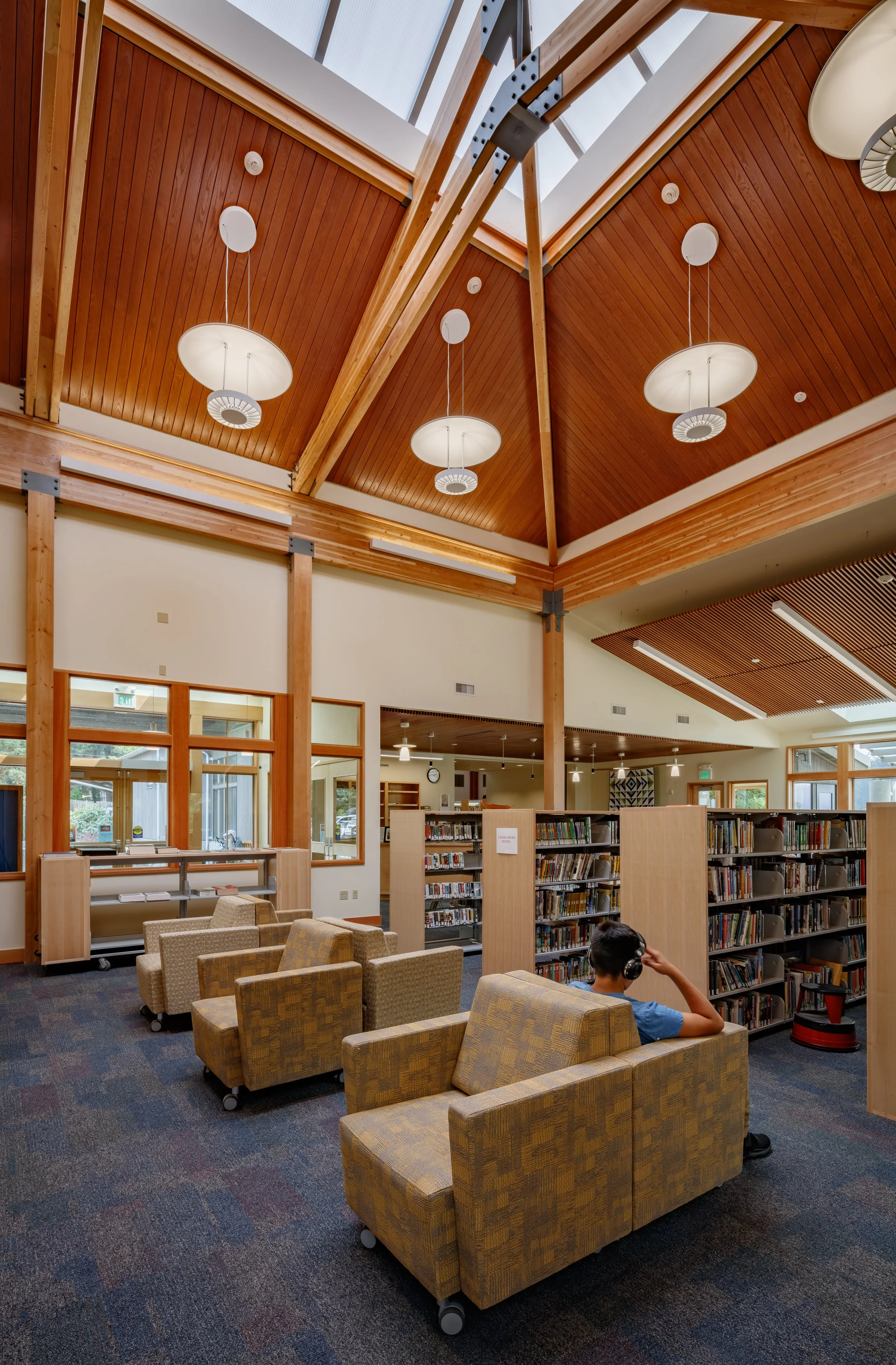The Orcas Island Library Expansion doubled the size of the orginal building, which was also designed by HKP architects and completed in 1992. The Expansion also features natural wood finishes and lofty daylight-filled spaces. There is more space for books, work tables, computer stations, reading areas, meeting rooms, and separate spaces for children and young adults. The Expansion was designed to accommodate the noisier spaces of the Library, allowing for the Existing Library to serve as a quiet reading and work area. The new Circulation Desk was relocated to the southeast corner of the Expansion providing a central location with visibility to the existing Reading Room and the new Reading Room. The computer stations were relocated to a larger area adjacent to the new Circulation Desk to allow for staff assistance and more workstations.